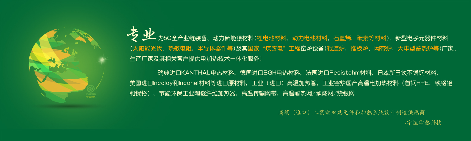 ??????公司專業(yè)生產(chǎn)各種精密電熱(電阻)合金、負(fù)載合金、各種電子陶瓷熱處理電熱元件、工業(yè)窯爐網(wǎng)帶及工業(yè)電加熱管。并代理和銷售瑞典進(jìn)口康泰爾電熱合金材料,日本新日鐵進(jìn)口不銹鋼材料,美國(guó)進(jìn)口Incoloy和Inconel材料等進(jìn)口合金產(chǎn)品。產(chǎn)品被運(yùn)用在5G產(chǎn)業(yè)鏈裝備、鋰電池正負(fù)極材料行業(yè)、"煤改電"行業(yè)、碳纖維行業(yè)、陶瓷電子專用設(shè)備、粉體材料、海綿鈦和釩鈦產(chǎn)業(yè)等領(lǐng)域。[詳情見宇恒產(chǎn)品]